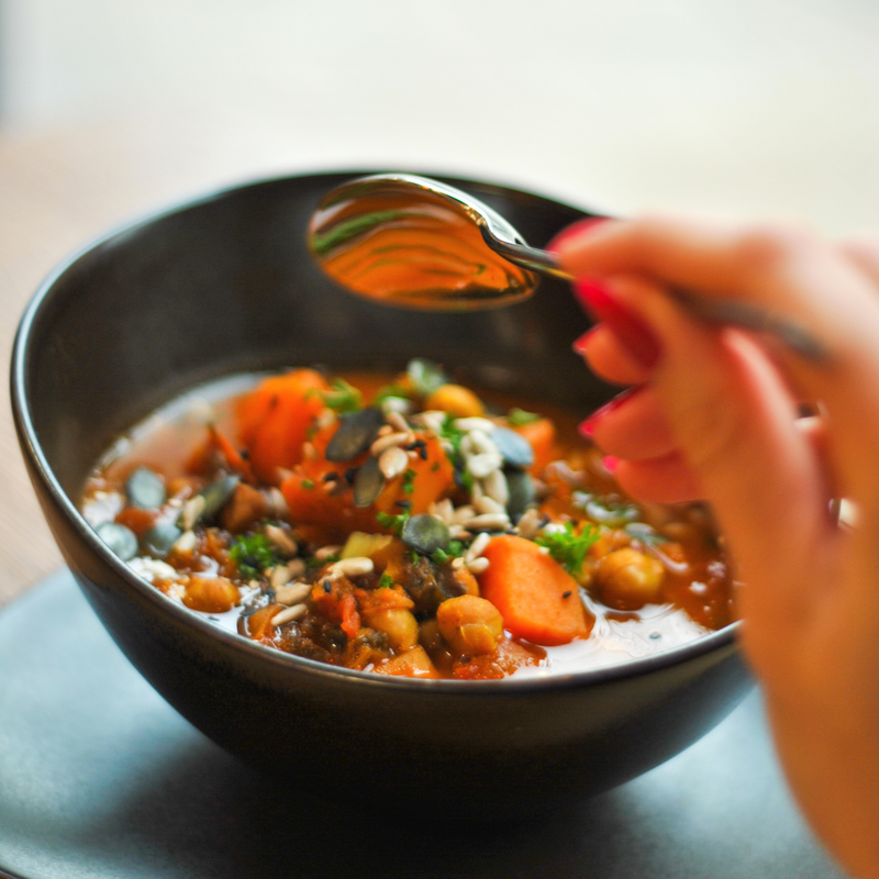 Ayurvedisches Süßkartoffelcurry mit grünen Erbsen, Natur-Basmatireis, Rote Linsen, Apfel, Möhre, indischer Gewürzmischung, Kokosmilch, Koriander, Frühlingszwiebeln, Limette, Kürbiskerne, Sesam